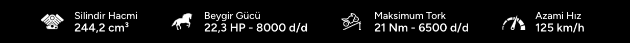 Güçlü Motor, Üstün Performans Seha 250’nin 22,3 HP - 8000 d/d’lik gücü, 21 Nm - 6500 d/d’lik torku, 4 zamanlı tek silindirli, 4 subaplı tek bujili motoru ile işte güç, işte performans demeye hazır ol! Maksimum sürüş keyfi ve performans için tasarlanan Seha 250, yollarda aradığın gücü sunuyor.